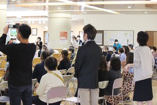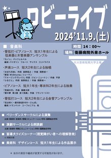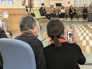 ホール中央には大きな吹き抜けがあり、差し込むやさしい自然光が人気で、多目的なイベントに使用されている。今回は地域の人や入院患者さん、そのご家族も楽しみにする定例の芸短ロビーライブ。