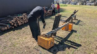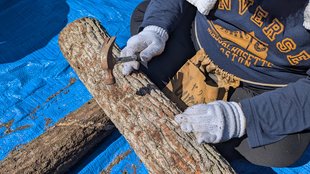 クヌギ・コナラなどの原木にドリルで穴を開け、種駒(菌のついた木片)をハンマーで打ち込む作業で、なかなかハードな業務。けっこうな量があるのですが、昨年はノリと勢いで一日で完了。昨年の反省から体への負担も考え、今年は2日に分けて作業を行いました。