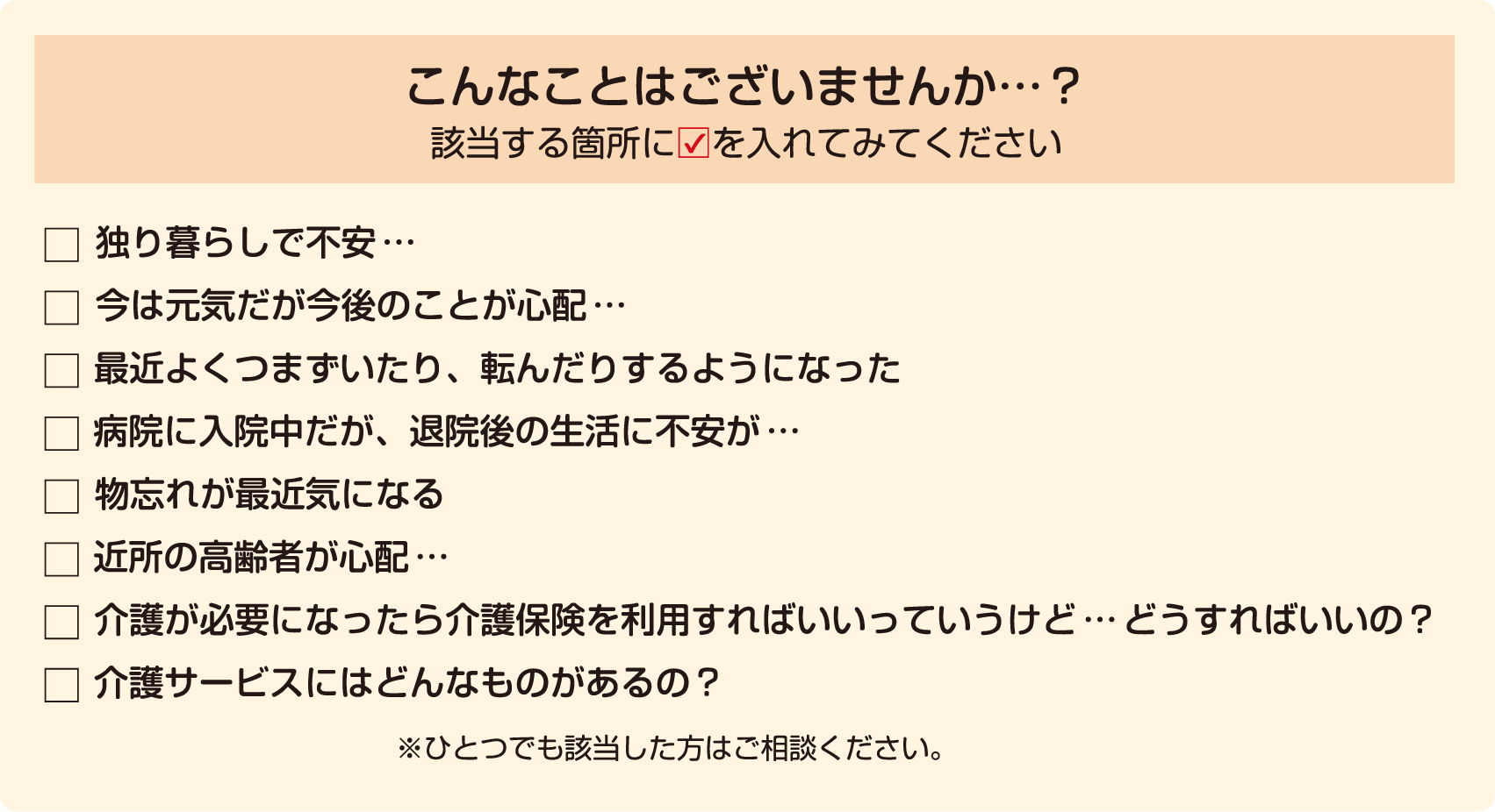 介護の必要な方やご家族のご要望を尊重し、最適な介護サービスが受けられるように支援します。介護サービスの計画や作成、サービス事業所との連絡・調整や介護に関する様々なコーディネートをケアマネージャーが行なっています。