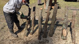 クヌギ・コナラなどの原木にドリルで穴を開け、種駒(菌のついた木片)をハンマーで打ち込む作業で、なかなかハードな業務。けっこうな量があるのですが、昨年はノリと勢いで一日で完了。昨年の反省から体への負担も考え、今年は2日に分けて作業を行いました。